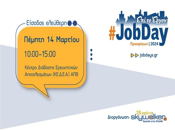 Το skywalker.gr – Εργασία στην Ελλάδα, στο πλαίσιο των δράσεών του «Επί το Έργον», διοργανώνει για ακόμα μία χρονιά το #JobDay Προσφύγων στη Θεσσαλονίκη, μια εκδήλωση για υποψηφίους που ανήκουν στην ευαίσθητη ομάδα των προσφύγων και επιθυμούν να ενταχθούν στην αγορά εργασίας.