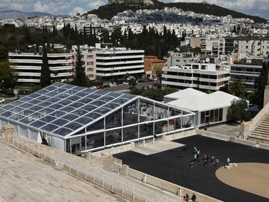 Ολοκληρώνονται οι εργασίες για το «ξήλωμα» της γιγαντιαίας κατασκευής που είχε τοποθετηθεί μπροστά από το Καλλιμάρμαρο, στο κέντρο της Αθήνας, και επρόκειτο να φιλοξενήσει το Coca Cola Leadership 2025.
