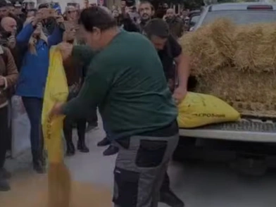 Οι συγκεντρωμένοι άδειασαν ζωοτροφές και δεμάτια σανού στον δρόμο, ενώ παρέδωσαν ψήφισμα με τα αιτήματά τους σε συνεργάτη του υπουργού.