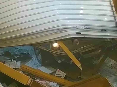 Τρίτη 12 Σεπτεμβρίου ώρα 04:27. Διακρίνεται το αγροτικό που αρχίζει να κάνει όπισθεν. Στα επόμενα δευτερόλεπτα καταγράφονται 6 χτυπήματα στα ρολά με το πρώτο να προκαλεί τις αρχικές καταστροφές.