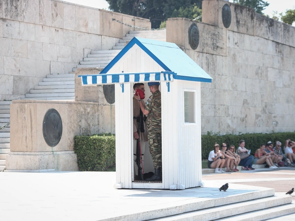 Η θερμοκρασία είναι τόσο υψηλή που οι εύζωνες μπήκαν μέσα στα κουβούκλια για να δροσιστούν. Στο σημείο βρίσκεται και στρατιώτης, ο οποίος τους δίνει νερό και τους σκουπίζει τον ιδρώτα διότι είναι ακίνητοι.