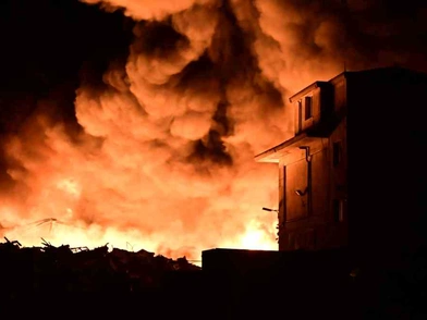 Σύμφωνα με τις τελευταίες πληροφορίες η φωτιά έχει περάσει την περίφραξη του εργοστασίου και οι πυροσβεστικές δυνάμεις έχουν απλωθεί σε ακτίνα 200 μέτρων προκειμένου να μην εξαπλωθεί, ενώ παράλληλα βρέχουν παρακείμενα κτίρια.