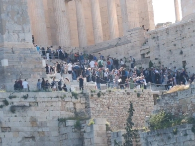 Από νωρίς το πρωί επικρατεί το αδιαχώρητο, καθώς χιλιάδες επισκέπτες —τουρίστες αλλά και πολλοί κάτοικοι της πόλης— εκμεταλλεύονται την ελεύθερη είσοδο για να επισκεφθούν τον Ιερό Βράχο.