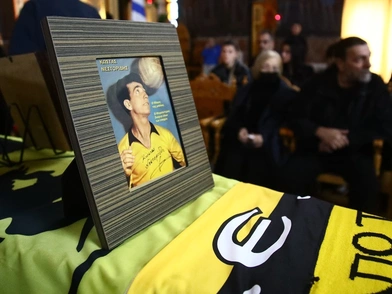 Από τις 11:00 η σορός τέθηκε σε λαϊκό προσκύνημα, με τους φιλάθλους της «Ένωσης» και ανθρώπους της διοίκηση να αποχαιρετούν τον «θρύλο» του συλλόγου. Η νεκρώσιμος ακολουθία ξεκίνησε στις 14:00, στον Ιερό Ναό Αγίας Τριάδας στη Νέα Φιλαδέλφεια, δίπλα από το γήπεδο της αγαπημένης του ομάδας.