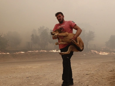 Στις συγκλονιστικές εικόνες της φωτιάς στη Φυλή, υπάρχει ένας κάτοικος που αποθανατίστηκε από το φακό την ώρα που κρατούσε ένα σκυλάκι στην αγκαλιά του, επιχειρώντας να το απομακρύνει από τον πύρινο κλοιό.