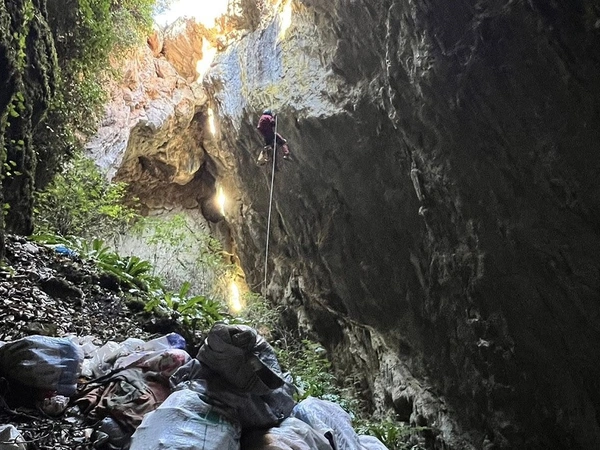 Η ομάδα «Χείρων» εντόπισε το κουταβάκι αλλά και σωρό από σκουπίδια στο σπήλαιο, διασώζοντας το κουταβάκι.