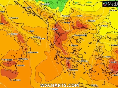 Με βάση χαρτών του site WXCharts, φαίνεται η Ελλάδα να επηρεάζεται ξεκάθαρα από την άνοδο της θερμοκρασίας.