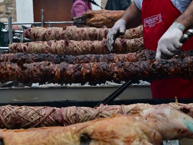 Η πλατεία και τα γύρω στενά έχουν πλημμυρίσει από τη μυρωδιά της τσίκνας, καθώς οι σούβλες με τα αρνιά, τα κατσίκια και τα κοκορέτσια γυρίζουν ασταμάτητα. Οι καταστηματάρχες, σε ρόλο οικοδεσπότη, κερνούν τους περαστικούς πασχαλινά εδέσματα, ενώ το φαγοπότι συνοδεύεται από τους ζωντανούς ήχους των μουσικάντηδων των καταστημάτων, με το μπουζούκι να παίζει δυνατά και να δίνει τον ρυθμό της ημέρας.