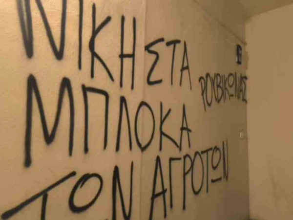 Τα μέλη της αναρχικής συλλογικότητας πέταξαν τρικάκια που έγραφαν «στη χώρα των μαφιόζων και των ολιγαρχών, νίκη στα μπλόκα των αγροτών» και έγραψαν ανάλογου περιεχομένου συνθήματα στους τοίχους.