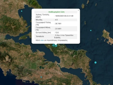 Πιο συγκεκρικένα, σεισμός μεγέθους 4,5 βαθμών της κλίμακας Ρίχτερ, καταγράφτηκε κατά τη διάρκεια της νύχτας της Κυριακής προς Δευτέρα (19/08) και συγκεκριμένα στις 03:23.