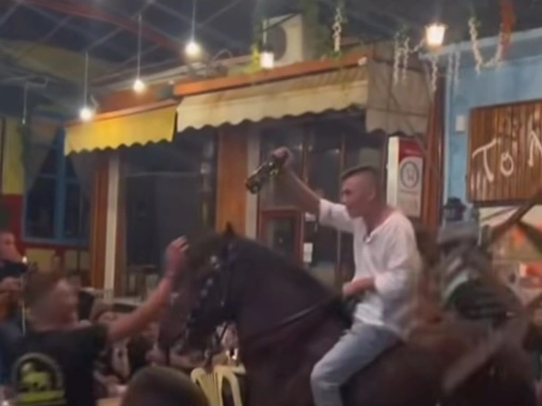 Συγκεκριμένα, στο βίντεο φαίνεται ένας θαμώνας να είναι καβάλα πάνω στο άλογο και να προσπαθεί να χορέψει χτυπώντας το, ενώ κάτω στο πάτωμα διακρίνονται γυαλιά από σπασμένα μπουκάλια. Το άλογο έχει αφηνιάσει, πηδώντας αλλοπρόσαλλα, ενώ ο νεαρός του σφίγγει τα λουριά για να το «κουμαντάρει».