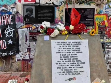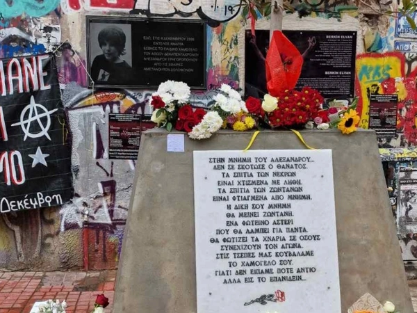 Ανήμερα της συμπλήρωσης 15 ετών από τις 6 Δεκεμβρίου του 2008, οι πολίτες θυμούνται τον 15χρονο Αλέξη στο μνημείο που έχει στηθεί στον τόπο που τραυματίστηκε θανάσιμα από αστυνομικά πυρά.