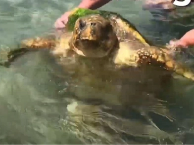 Σε βίντεο φαίνονται λουόμενοι να προσεγγίζουν τη χελώνα και να τη σηκώνουν από το καύκαλό της, και άλλους να την πιάνουν από το πτερύγιο, συνοδεύοντάς την προς τα βαθιά.