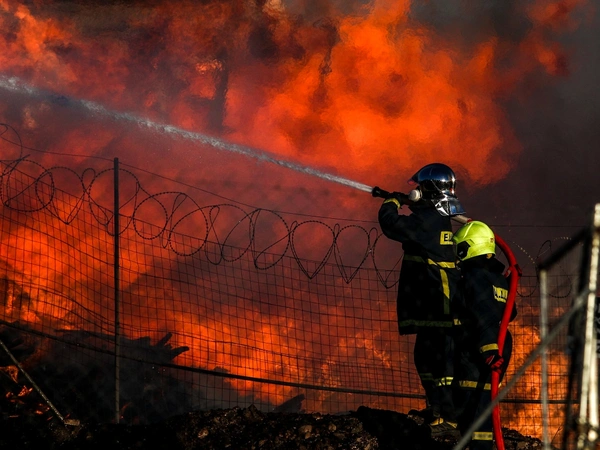 Στην περίφραξη της γειτονικής επιχείρησης έχουν χτίσει εγκαταστάσεις πυρόσβεσης, σε μια προσπάθεια να κρατήσουν όσο γίνεται τη φωτιά εντός του οικοπέδου, όπου έχει αναπτύξει το δικό της κλίμα.