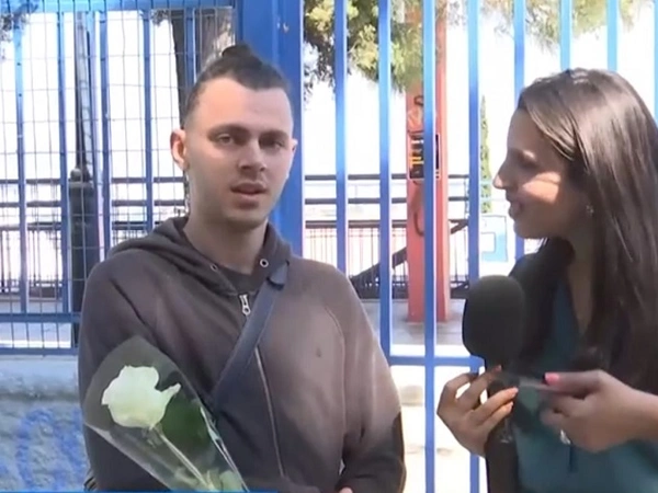 Τον Νίκο τον εντόπισαν τηλεοπτικές κάμερες έξω από το εξεταστικό κέντρο και η εικόνα του με ένα λευκό τριαντάφυλλο τράβηξε τα βλέμματα των περαστικών, που περνούσαν εκείνη την ώρα από το σημείο.