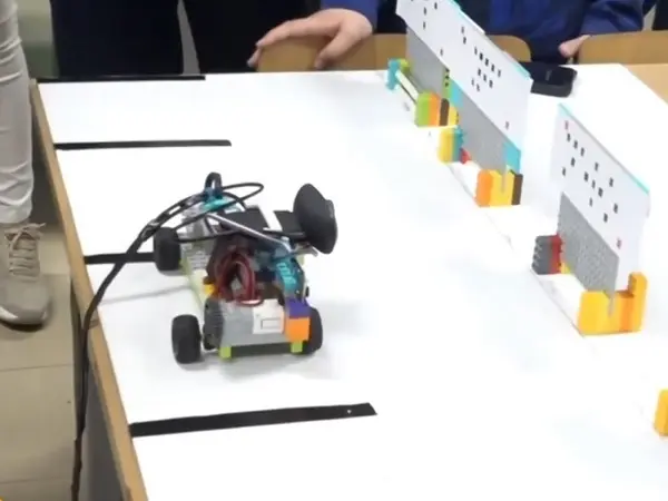 «Έχουμε ένα πρόγραμμα, με το οποίο όταν πατάμε το αριστερό βέλος, ξεκινάει ένα αμαξάκι που σταματάει όταν βλέπει μία μαύρη γραμμή» συμπλήρωσε μαθητής του Γυμνασίου για το πώς λειτουργεί η εφαρμογή.