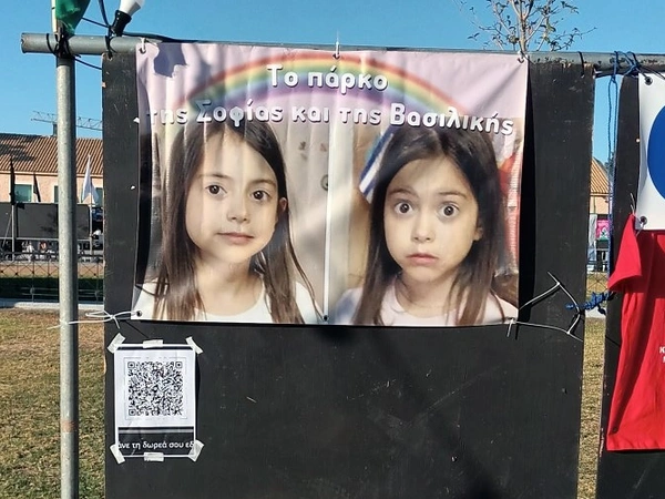 Μια εικόνα που ξεχώρισε ήταν αυτή του αυτοσχέδιου πάγκου που στήθηκε μέσα σε λίγα λεπτά, με ένα πλακάτ από πίσω που είχε τις φωτογραφίες δύο μικρών κοριτσιών και έγραφε «Το πάρκο της Σοφίας και της Βασιλικής».