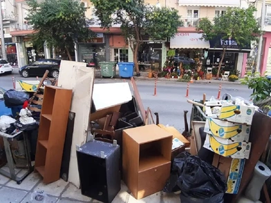 Με ντουλάπια, κούτες, σιδερένια αντικείμενα, ακόμα και κούκλες βιτρίνας γέμισε το πεζοδρόμιο σε σημείο της οδού Μάρκου Μπότσαρη στη Θεσσαλονίκη, καθώς ένας πολίτης επέλεξε να αδειάσει αφήσει εκεί ότι δεν χρειάζονταν από υπόγειο οικοδομής, το οποίο άδειασε.