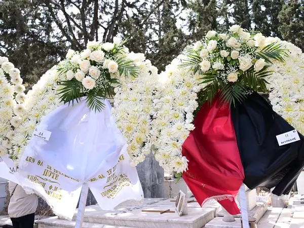 Μαυροκόκκινα στεφάνια, στεφάνια από την Εναλλακτική Παρέμβαση Δικηγόρων Αθήνας και Παλαιστινιακών οργανώσεων και επίσημων φορέων συνέθεταν το σκηνικό στην κηδεία του Σπύρου Φυτράκη.