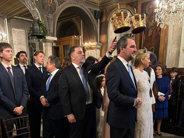 Σε μία από τις εικόνες διακρίνονται μάλιστα τα στέμματα που αντί για στέφανα τοποθετήθηκαν στα κεφάλια της νύφης και του γαμπρού και ανήκουν στην οικογένεια του τέως βασιλιά Κωνσταντίνου.