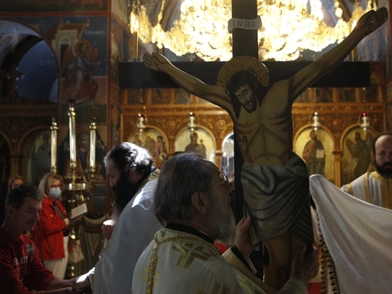 Ο Σταυρός και τα Εξαπτέρυγα ηγούνται της πομπής και ακολουθούν οι ιερείς και οι πιστοί, που κρατούν αναμμένες λαμπάδες. Στις πόλεις προηγούνται μουσικοί, οι οποίοι παίζουν πένθιμα εμβατήρια, σύμφωνα με το ΑΠΕ-ΜΠΕ.