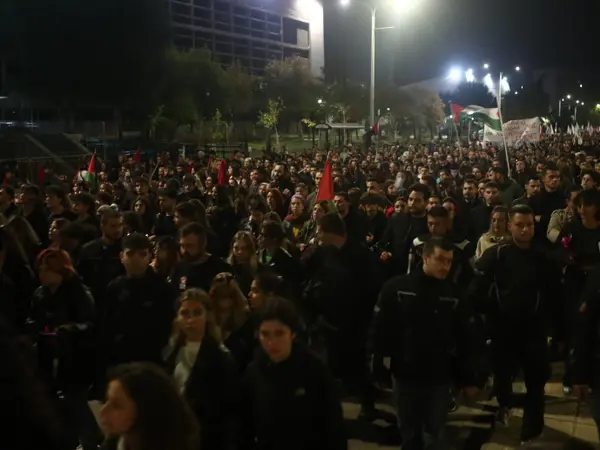 Στη φετινή πορεία κυριαρχούν συνθήματα κατά του ιμπεριαλισμού και υπέρ της Παλαιστίνης.