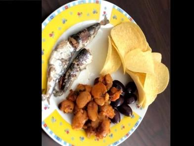 Τελευταίο και καλύτερο πιάτο, είναι οι σαρδέλες με φασόλια, ελιές και πατατάκια, στο οποίο έδωσε ένα τιμιότατο 5/10, αν και δεν φαίνεται και πολύ λαχταριστό αν μη τι άλλω. Πάντως τα φασόλια φαίνεται να έχουν την τιμητική τους, αφού σερβίρονται σχεδόν καθημερινά, με κάθε πιθανό συνδυασμό που μπορεί να μην είχαμε καν φανταστεί.