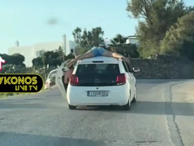 Τη ζωή του κορώνα - γράμματα έπαιξε επιβάτης οχήματος, που ξάπλωσε μπρούμυτα στην οροφή ενός μικρού αυτοκινήτου το οποίο βρίσκεται εν κινήσει σε δρόμο της Μυκόνου την ώρα που ένας άνδρας από την παρέα έχει ανοίξει την πίσω πόρτα και τον τραβάει βίντεο για να το ανεβάσει στα μέσα κοινωνικής δικτύωσης.