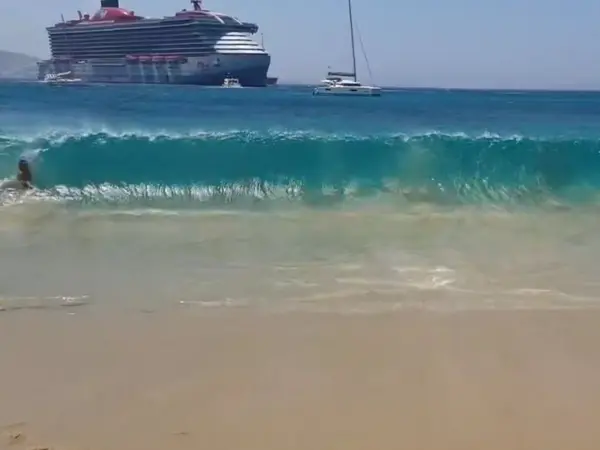 Ένα πλοίο της γραμμή που εκτελούσε το δρομολόγιο Ραφήνα - Μύκονος, προκάλεσε πανικό στην παραλία του Αγίου Στεφάνου με τα κύματα που σήκωσε.