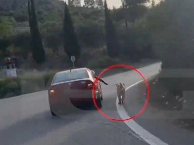 Όπως φαίνεται και στα πλάνα που εξασφάλισε το MEGA, το αυτοκίνητο βρίσκεται εν κινήσει, με τον συνοδηγό να κρατά το λουρί του σκύλου, ο οποίος έτρεχε στο πλάι, έξω από το όχημα.