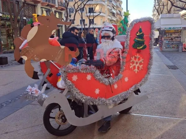Ο διανομέας ντύθηκε Άγιος Βασίλης ενώ μετέτρεψε το μηχανάκι του σε έλκηθρο.