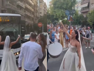 Η χαρά της ήταν τέτοια, που μία πανέμορφη νύφη στη Θεσσαλονίκη, μαζί με τις φίλες της, καλεσμένους και νταούλια, βγήκε στη μέση της Μητροπόλεως και χόρευε μπροστά από λεωφορείο του ΟΑΣΘ, το οποίο σταμάτησε και διέκοψε την κυκλοφορία.