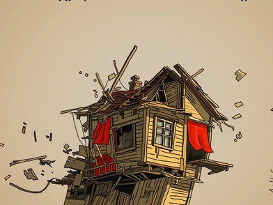 Στο σκίτσο ένα ξύλινο οίκημα με κόκκινες κουρτίνες καταρρέει, ενώ στη λεζάντα αναγράφεται: «Μια κατεδάφιση είναι θλιβερό θέαμα. Όσο άχρηστο κι αν είναι το κτήριο».