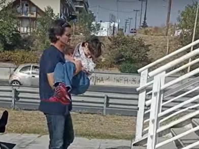 Το αναπηρικό αμαξίδιο ήταν αδύνατο να ανεβεί τα πολλαπλά σκαλοπάτια της γέφυρας, ακόμα και με τη βοήθεια συνοδού, οπότε ο πατέρας χρειάστηκε να κουβαλήσει στην αγκαλιά του το παιδί του...