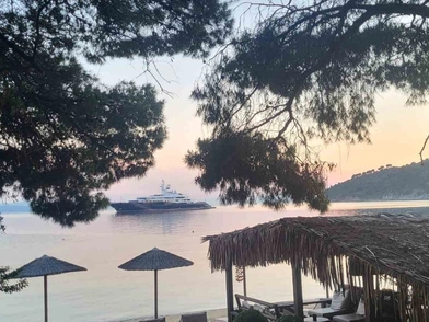 Η πολυτελής θαλαμηγός, έφθασε στον όρμο των Κουκουναριών και αγκυροβόλησε απέναντι από την εκπληκτική Μάραθα και μπροστά από το ξενοδοχείο "Skiathos Palace".