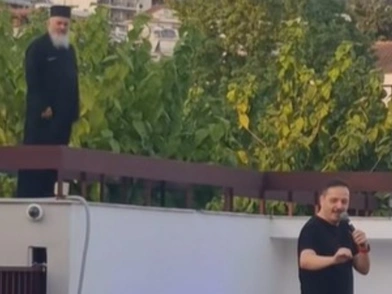 Ένας ιερέας εμφανίστηκε ξαφνικά σε υπερυψωμένο σημείο πίσω του, προκαλώντας γέλια τόσο στο κοινό όσο και στον ίδιο.