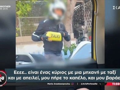 Συγκεκριμένα, ο οδηγός της μηχανής ακολουθεί το ταξί, με την επαγγελματία οδηγό να ακούγεται να λέει: «Ναι γεια σας, σάς παρακαλώ μπορείτε να στείλετε ένα περιπολικό Χατζηκυριάκου. Είναι ένας κύριος με μία μηχανή με ταξί και με απειλεί, μού πήρε το καπέλο, και μου βαράει συνέχεια το ταξί και έχω και κόσμο μέσα. Ναι, έχω το ταξί, μπορείτε να στείλετε ένα περιπολικό; Μου πήρε το καπέλο αυτήν τη στιγμή».