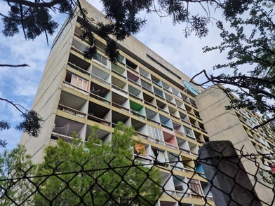 Μπαίνοντας στον προαύλιο χώρο, διακρίνουμε μερικούς φοιτητές να κάθονται στα μπαλκόνια των δωματίων τους και να αγναντεύουν το τσιμεντένιο προαύλιο που απλώνεται μπροστά. Είναι μια κατασκευή που δε θυμίζει σε τίποτα φοιτητικές εστίες ενός σύγχρονου ευρωπαϊκού κράτους. Μέσα στο δαιδαλώδες προαύλιο, υπάρχουν μερικά γκραφίτι που δείχνουν μια απέλπιδα προσπάθεια να πάρει χρώμα το όλο οικοδόμημα, αλλά τελικά απορροφώνται και αυτά μέσα του, τόσο που φαίνεται να μην έχουν λόγο ύπαρξης. Το γκρι, άχρωμο τσιμέντο, καταπίνει τα πάντα.