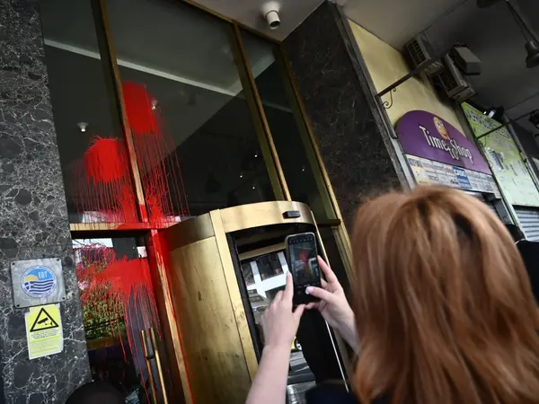 Μάλιστα, στο σημείο, για λίγο, επικράτησε ένταση όταν διαδηλωτές έκαναν παρέμβαση με μπογιές, πετώντας 'τις στο ξενοδοχείο στην Ομόνοια, γεγονός που προκάλεσε την παρέμβαση των αστυνομικών δυνάμεων.