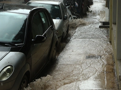 Η σφοδρή βροχόπτωση άρχισε στην Αθήνα στις 14:00. Πολίτες και τουρίστες προσπαθούσαν να προφυλαχθούν από το νερό με ομπρέλες και κάτω από υπόστεγα.
