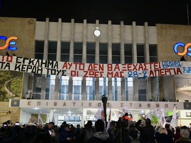 Έξω από το κτίριο του ΟΣΕ συγκεντρώθηκαν με πανό, συνθήματα, λουλούδια και κεριά σωματεία εργαζομένων και φοιτητικοί σύλλογοι, φωνάζοντας συνθήματα.