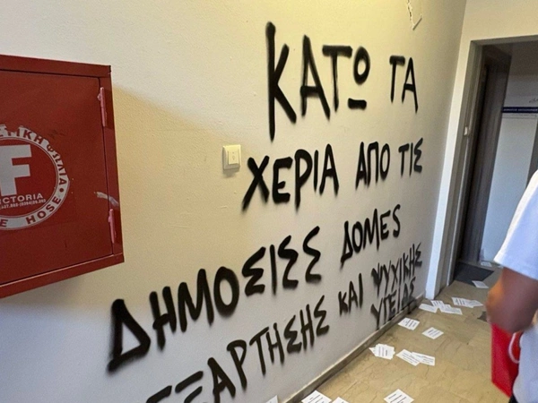 Παρέμβαση από τον Ρουβίκωνα με συνθήματα στον τοίχο του πολιτικού γραφείου του Δημήτρη Βαρτζόπουλου, Υφυπουργού Υγείας και αρμόδιου για θέματα ψυχικής υγείας, «ενάντια στη διάλυση των δημόσιων δομών απεξάρτησης και ψυχικής υγείας», όπως αναφέρει η συλλογικότητα σε ανάρτησή της.