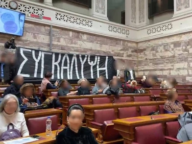 Παρέμβαση για τα Τέμπη σε εκδήλωση του Ιδρύματος της Βουλής για την Ρόζα Ιμβριώτη, στην αίθουσα της Γερουσίας, πραγματοποίησαν μέλη του Ρουβίκωνα το βράδυ της Τετάρτης (5/2).