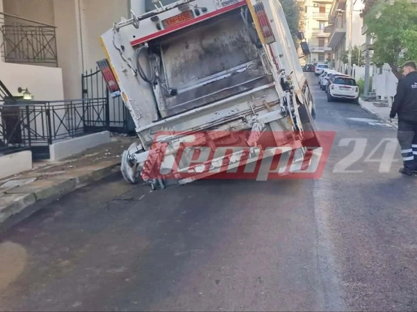 Καθίζηση σημειώθηκε στο οδόστρωμα, επί της οδού που οδηγεί στο Δασύλλιο, από την πλευρά της οδού Καρόλου, στην Πάτρα, με αποτέλεσμα να «βυθιστεί» απορριμματοφόρο.