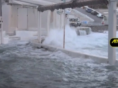 Όπως φαίνεται και στα σχετικά πλάνα που έρχονται στο φως της δημοσιότητας από τη Μύκονο, η περιοχή έχει γεμίσει με νερά και μοιάζει σαν πισίνα.