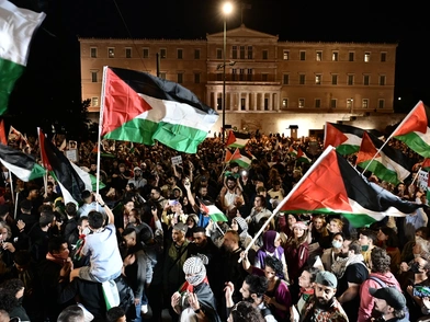Με κεντρικό σύνθημα «Λευτεριά στην Παλαιστίνη» χιλιάδες διαδηλωτές που συμμετείχαν στη συγκέντρωση στο Σύνταγμα πραγματοποιούν αυτή την ώρα πορεία προς την πρεσβεία του Ισραήλ στην Αθήνα.