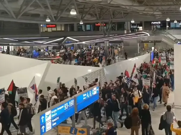 Με συνθήματα «να σταματήσει τώρα η σφαγή τώρα στη Γάζα» και «λευτεριά στην Παλαιστίνη» τα μέλη του ΠΑΜΕ μπήκαν μέσα στο αεροδρόμιο με πανό, πικέτες και σημαίες της Παλαιστίνης, ενώ πιο έντονα ήταν τα συνθήματα μπροστά από τα desk όπου γίνονται τα check in που εξυπηρετούν τις ισραηλινές αερογραμμές.