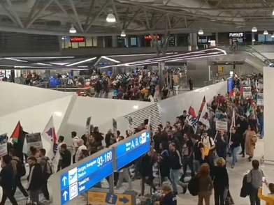 Πορεία αλληλεγγύης στην Παλαιστίνη μέσα στο αεροδρόμιο «Ελευθέριος Βενιζέλος» πραγματοποίησαν μέλη του ΠΑΜΕ, με φόντο την επιχείρηση του στρατού του Ισραήλ στη Λωρίδα της Γάζας.