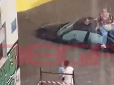 Όπως παρουσίασε το MEGA, στην οδό Aχαΐας στους Αμπελοκήπους, μία γυναίκα αναγκάστηκε να ανέβει στην οροφή του αυτοκινήτου της για να σωθεί, καθώς αυτό παρασυρόταν από τα ορμητικά νερά.