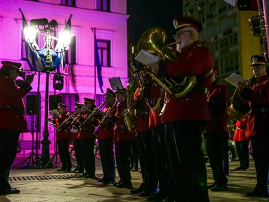 Ένα συγκινητικό αφιέρωμα – έκπληξη στον Διονύση Σαββόπουλο έκανε η μπάντα του δήμου Αθηναίων, στο πλαίσιο της εκδήλωσης που έγινε στην πλατεία Κοτζιά, για τη ροζ φωταγώγηση του δημαρχείου -για τον μήνα Οκτώβριο που είναι αφιερωμένος στον καρκίνο του μαστού.